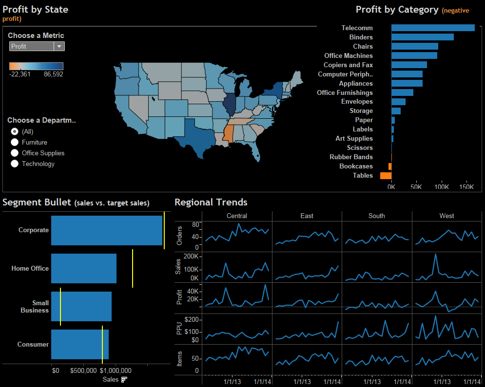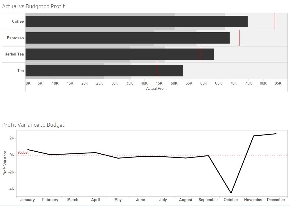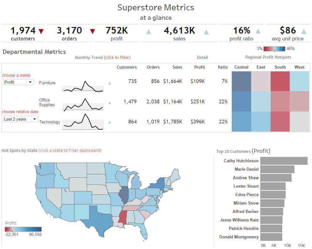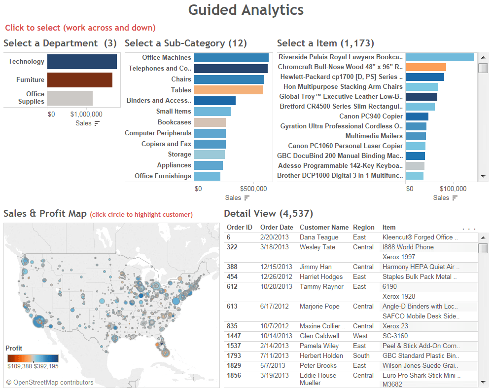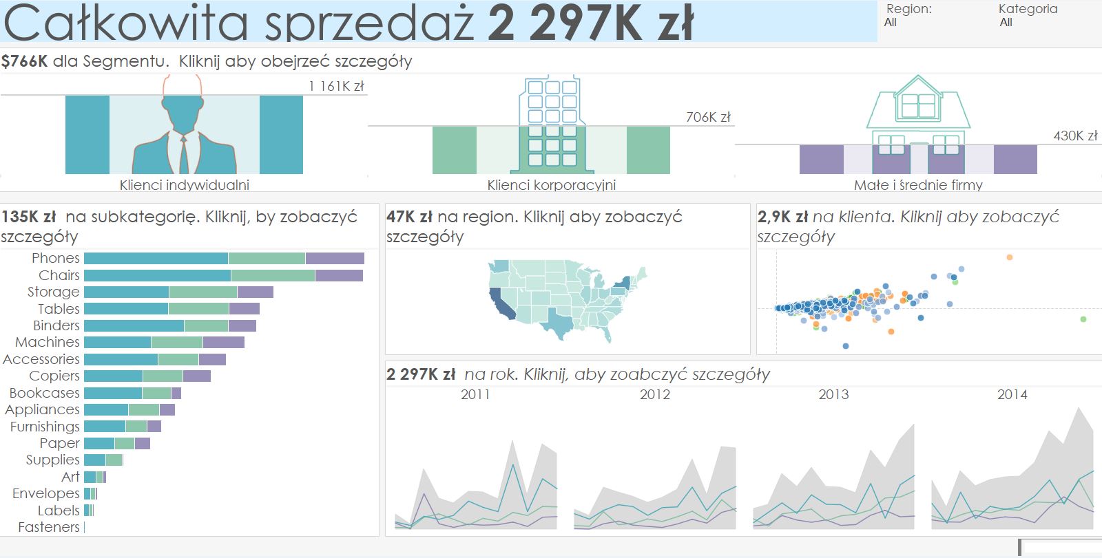 Wartością dodaną dashboardu jest możliwość analizowania danych jednocześnie na kilku wizualizacjach, dzięki czemu uzyskujemy kontekst, który pozwala o wiele szybciej wyciągać wnioski, w porównaniu do analiz danych w postaci tabel tekstowych lub wykresów, które często umieszczone są w oddzielnych arkuszach. W Tableau w szybki sposób możemy dodawać filtry, parametry, tworzyć szybkie kalkulacje i drillować dane poprzez hierarchizowanie zmiennych tak, aby uzyskać szczegółowe informacje nawet do poziomu pojedynczego zamówienia.