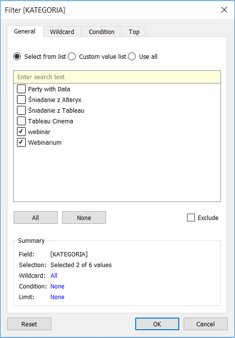 W kolejnym oknie zaznaczam obie pozycje, klikam ‘Group’ i nadaję nazwę Grupy, która będzie wyświetlała się jako oddzielna pigułka w panelu z danymi. Jeśli nasz raport miałby zawierać dane dotyczące tylko webinariów, to ze względu na to, że inne kategorie zostały wcześniej odfiltrowane nie musielibyśmy tworzyć tej grupy. Dobrze jest mimo wszystko zachować pewien porządek w danych, ponieważ zawsze mamy możliwość powrotu do wcześniej stworzonych filtrów i dodania do analizy innych kategorii. Gdybyśmy tak zrobili nie mając stworzonej grupy, dane zaczęłyby się nam ”rozjeżdżać” na poziomie kategorii, a tego przecież nie chcemy.