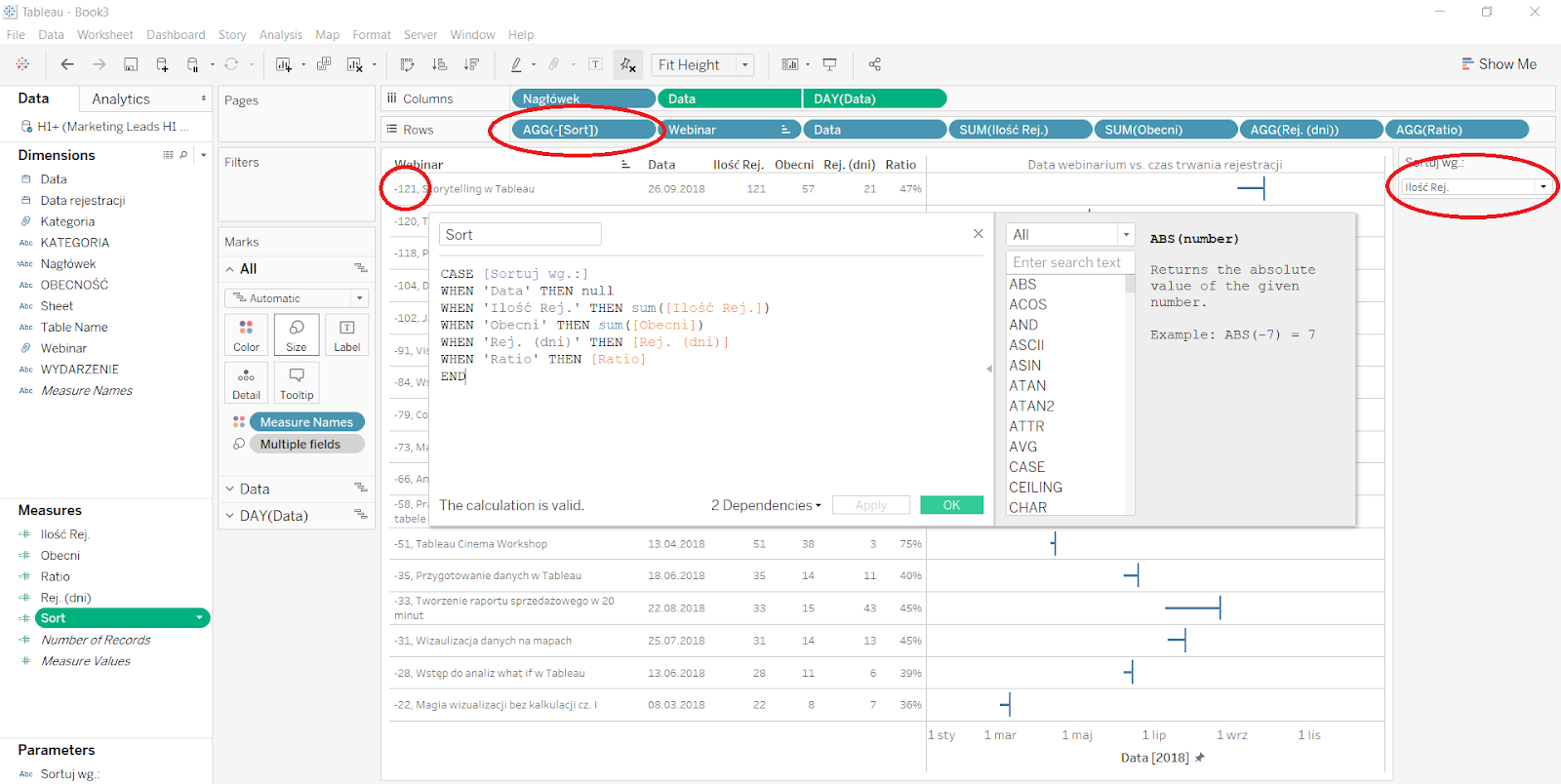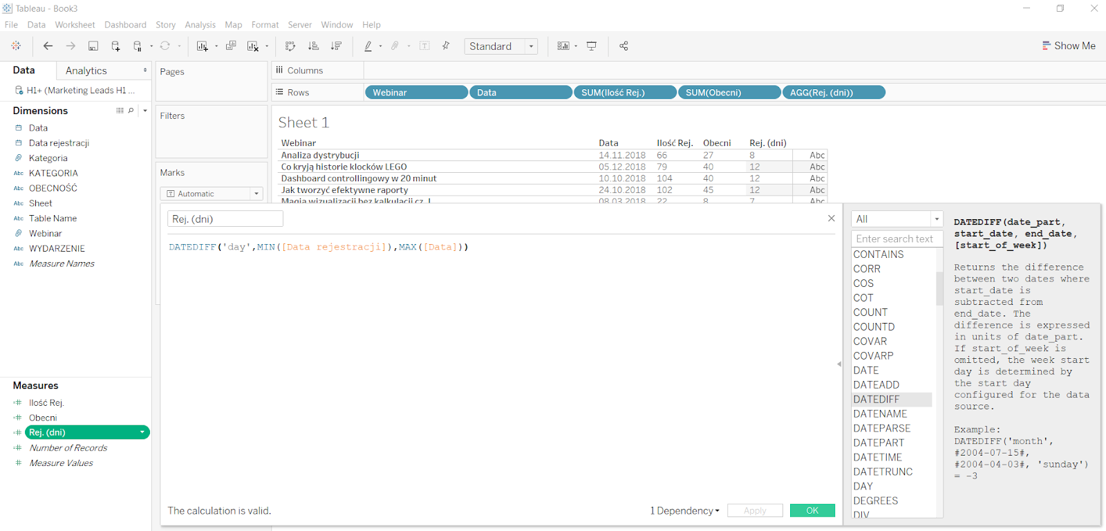 Ponieważ chcemy policzyć ilość dni od pierwszej rejestracji do wydarzenia, to zgodnie ze składnią, którą nam podpowiada Tableau, najpierw definiujemy w jakiej formie ma być wyświetlany wynik (‘day’), następnie data pierwszej rejestracji, a więc z agregacją ‘MIN()’, a następnie data wydarzenia. Druga data ma agregację ‘MAX()’. Nie wpływa to na wynik kalkulacji, ale jeśli agregowaliśmy pierwszy czynnik, to musimy to zrobić również z kolejnym, ponieważ inaczej Tableau nie zaakceptuje kalkulacji.
