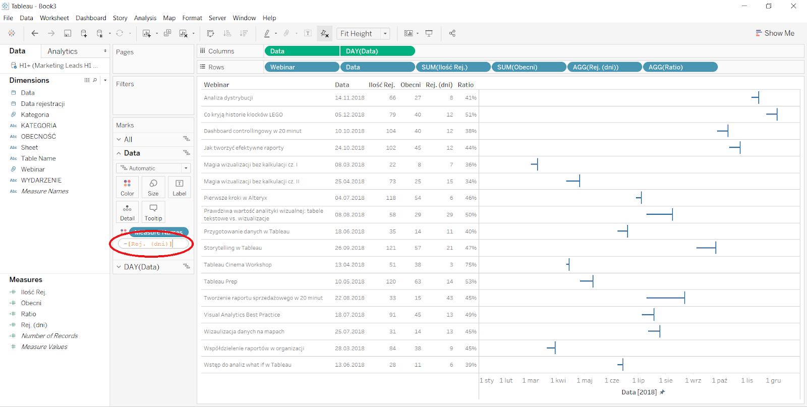 Do obszaru ‘Columns’ dwukrotnie przenoszę datę wydarzenia. Pierwsza pigułka ma właściwości ‘Exact Date, Continous’, a druga ‘Day, Continous’. Rozwijając właściwości drugiej pigułki tworzę wykres Dual Axis, a następnie skalę obu osi blokuję ustawieniami ‘Fixed start: 01.01.2018’, ‘Fixed end: 31.12.2018’. Następnie ukrywam górną oś, a mój widok wygląda tak, jak na ilustracji poniżej.