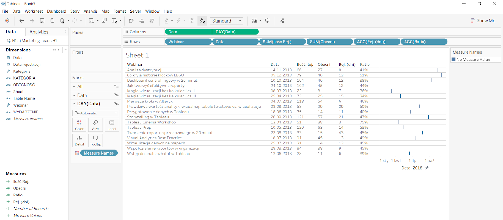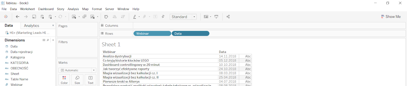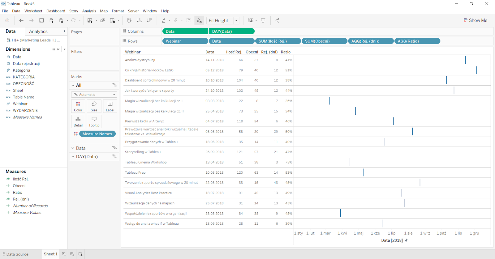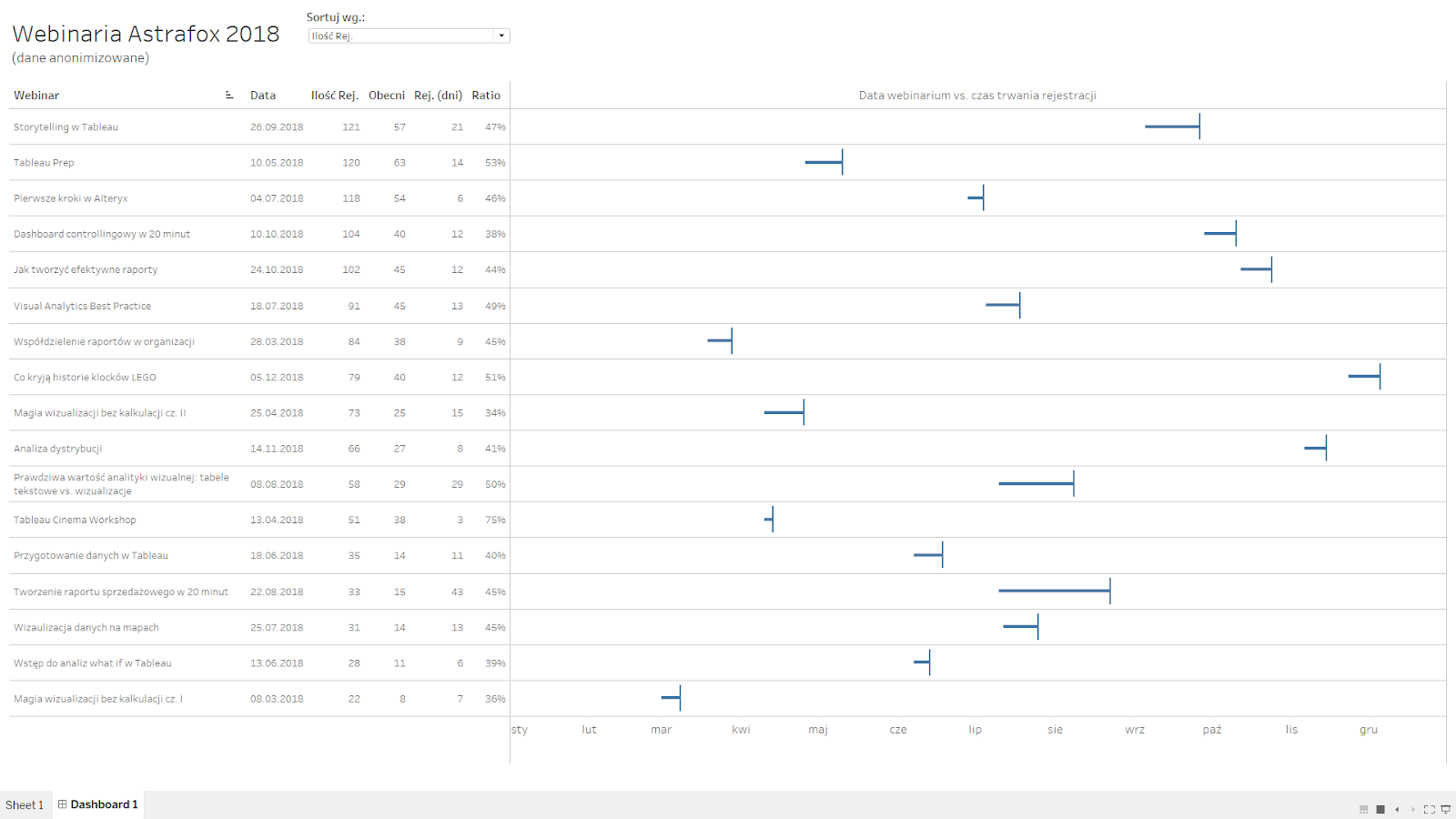 Koniec starego roku i początek nowego to czas podsumowań, dlatego dzisiaj pokażę Ci, jak przy pomocy Tableau stworzyć bardzo szybką i efektywną analizę wydarzeń, które były organizowane w danym okresie. Będziemy pracować w obrębie jednej zakładki, która pod koniec stanie się funkcjonalnym dashboardem.