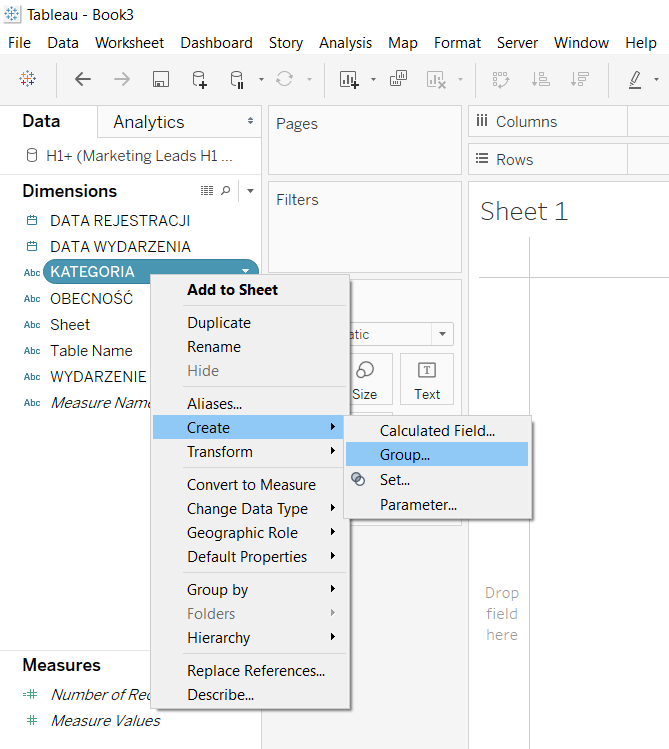Krótki komentarz do przygotowania danych. Na tym etapie możemy wybrać jedną z dwóch dróg – przygotować dane w Tableau Desktop (wraz z grupowaniem o którym za chwilę opowiem) lub wykonać wszystkie te czynności w Tableau Prep. Ja zdecydowałem się na użycie Tableau Desktop, aby nie sugerować Ci wykonywaniem bardzo prostych czynności w Prep, że Tableau Desktop sobie z nimi nie poradzi. Obie drogi mają swoje dobre i złe strony, w Prep zrobisz to szybciej, a w Desktop będziesz mógł łatwiej edytować filtry, cofając się do poprzedniego okna, a nie do innej aplikacji.