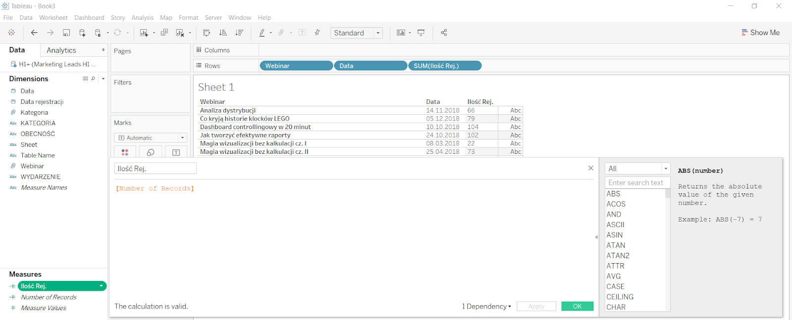 Kolejną miarą, której nie mamy w bazie, ale z łatwością możemy stworzyć, jest ilość uczestników obecnych na webinariach. W tym celu tworzę nowe pole kalkulowane, które nazywam ‘Obecni’, a jego treść wygląda następująco: