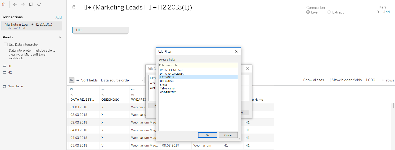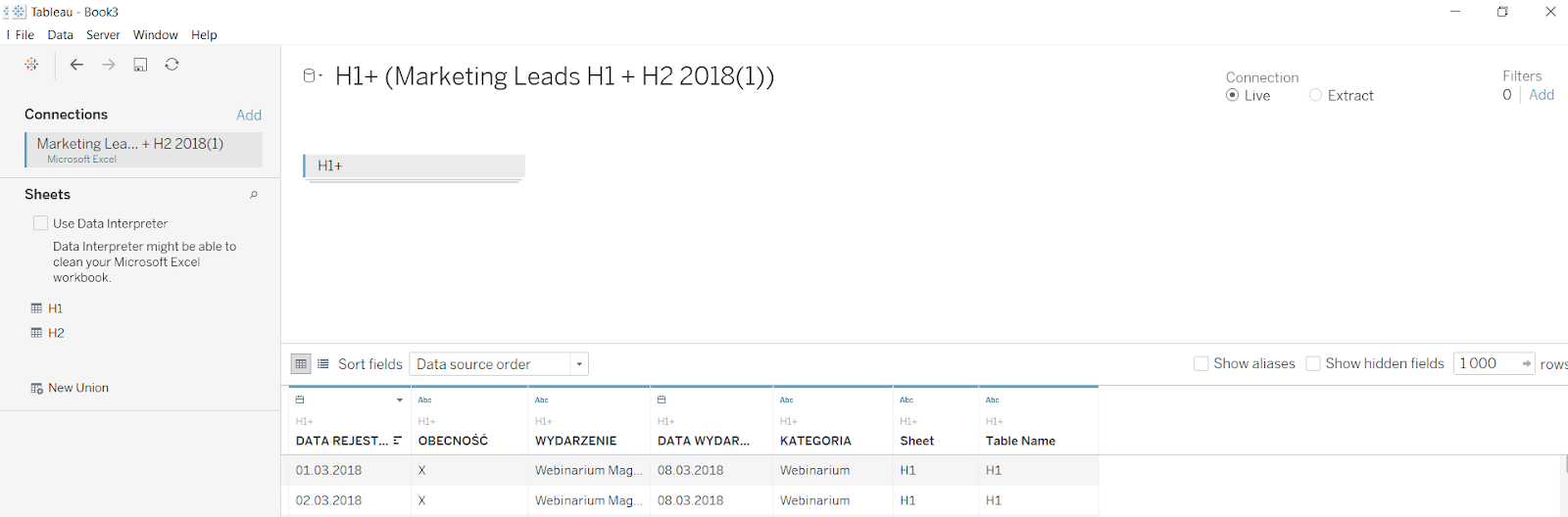 W moim pliku dane są podzielone na dwie zakładki – pierwsze i drugie półrocze. Zaczniemy od połączenia tych dwóch tabel tworząc Union. Żeby stworzyć Union dwóch tabel, czyli połączyć je w jedną, dopisując rekordy z jednej z nich pod rekordami z drugiej, zaznaczam z wciśniętym klawiszem Ctrl obie tabele (H1 i H2) i przenoszę do obszaru opisanego ‘Drag sheets here’. W tym przypadku tabele H1 i H2 odpowiadają zakładkom w Excelu, natomiast proces ten wyglądałby identycznie w przypadku podłączenia do baz danych.