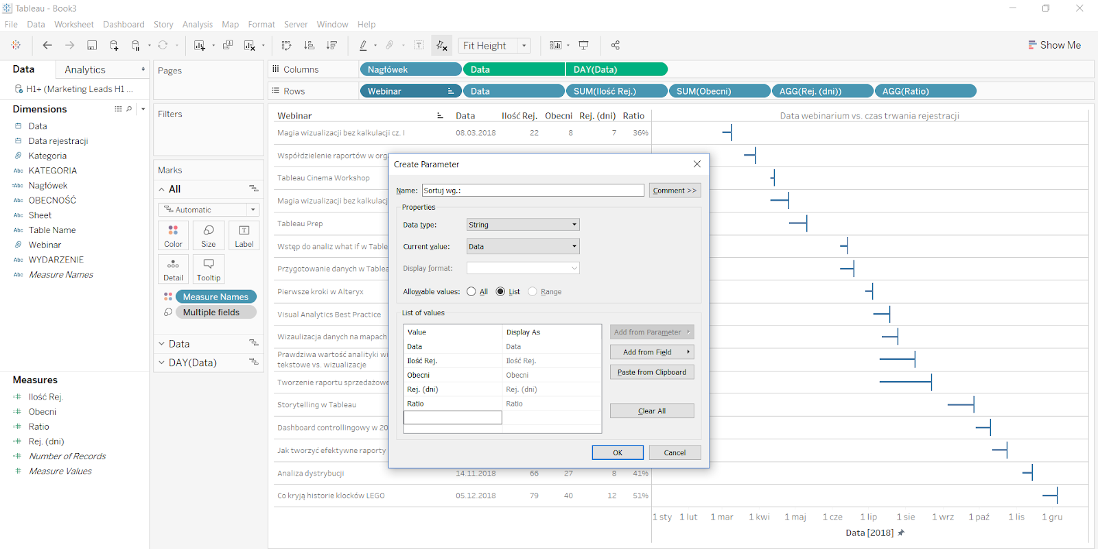 Idąc o krok dalej, możemy dać użytkownikowi możliwość sortowania webinariów według wybranej miary. Jak to zrobić? Tworzę parametr o następujących właściwościach, gdzie pozycje na liście odpowiadają miarom, które pokazujemy na wizualizacji: