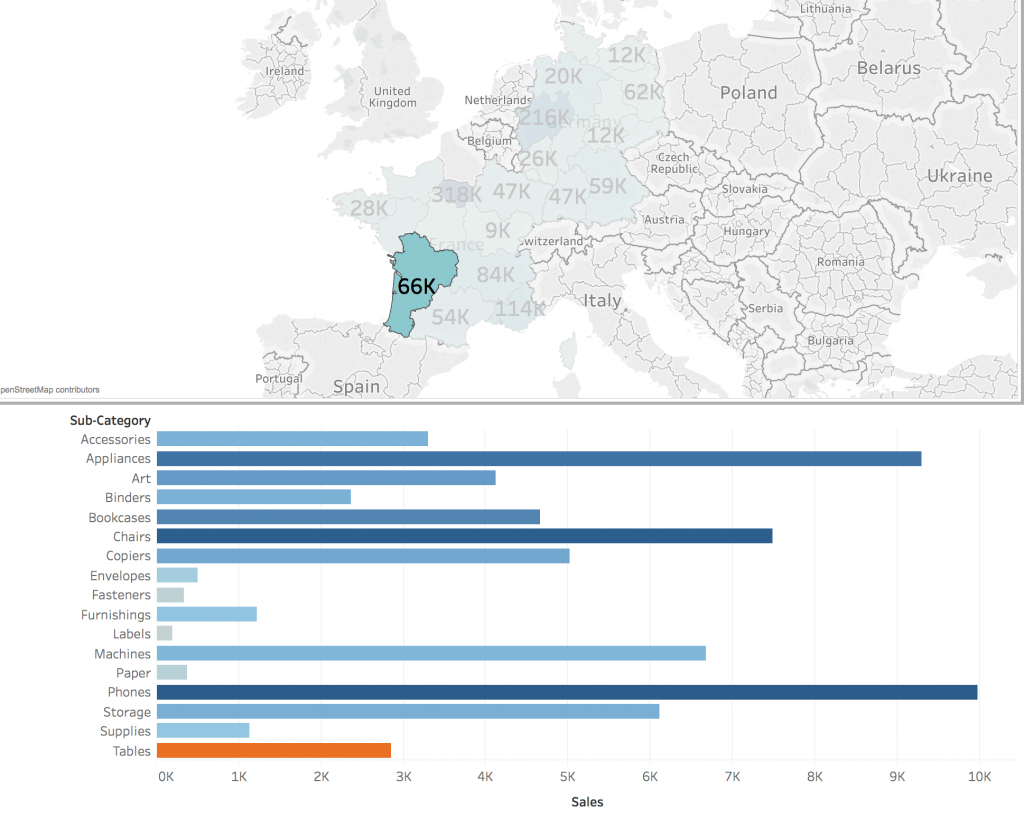 rys. 7 – mapa użyta jako filtr dla wykresu słupkowego prezentującego wielkość sprzedaży w podziale na sub-kategorie produktowe