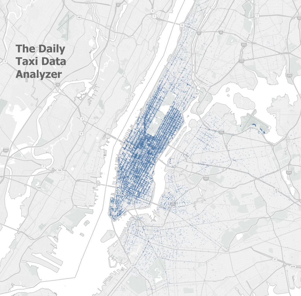 rys. 9 – natężenie miejsc rozpoczęcia podróży taksówką w Nowym Jorku (opracowanie własne na podstawie wizualizacji Russella Spangera Iron Viz 2016)