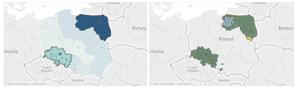 *- powiaty i gminy nie są dostępne w Tableau jako natywne granule terytorialne, możliwe jest wgranie do Tableau odpowiednich słowników aby uzyskać wspomniane obszary geograficzne