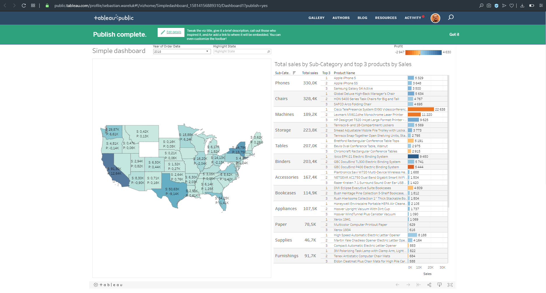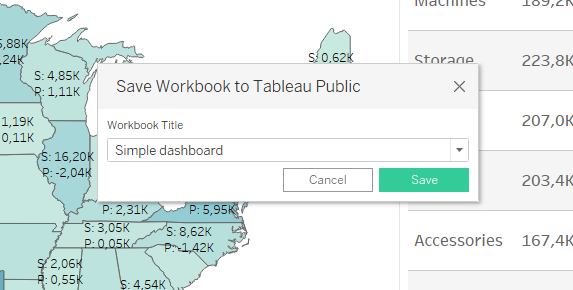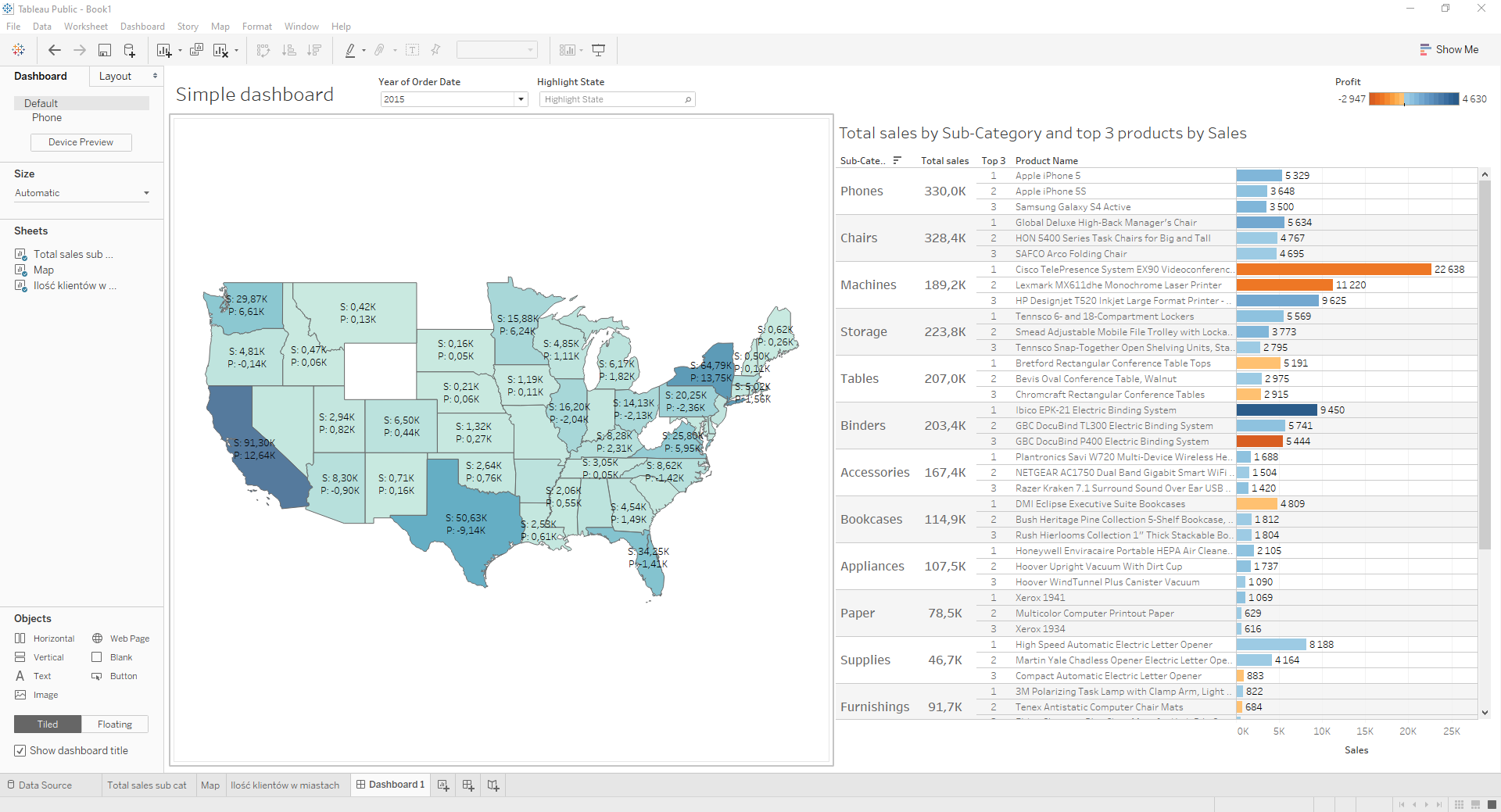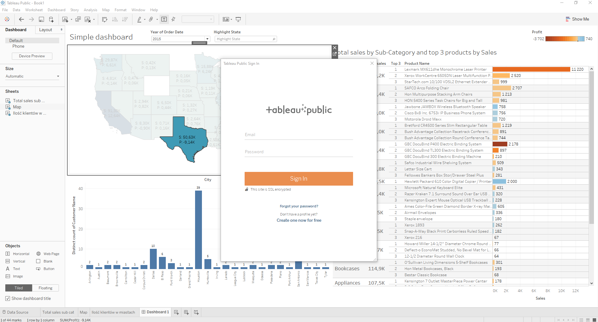 Pierwsze co rzuca się w oczy to ograniczona ilość connectorów do danych oraz link pozwalający na otworzenie workbooka zapisanego na naszym koncie Tableau Public. Po wyborze tej opcji naszym oczom ukaże się okno logowania, a następnie będziemy mogli wybrać jeden z projektów, które znajdują się na naszym profilu. Wychodzę jednak z założenia, że dopiero założyliśmy konto i nic jeszcze się w nim nie znajduje. Dlatego przejdźmy do podłączenia przykładowych danych (ja skorzystałem z bazy Sample – Superstore), a następnie do budowy dashboardu. Ponieważ ten artykuł ma na celu pokazanie samego mechanizmu działania Tableau Public, to pominę szczegóły związane z tworzeniem przykładowego raportu.