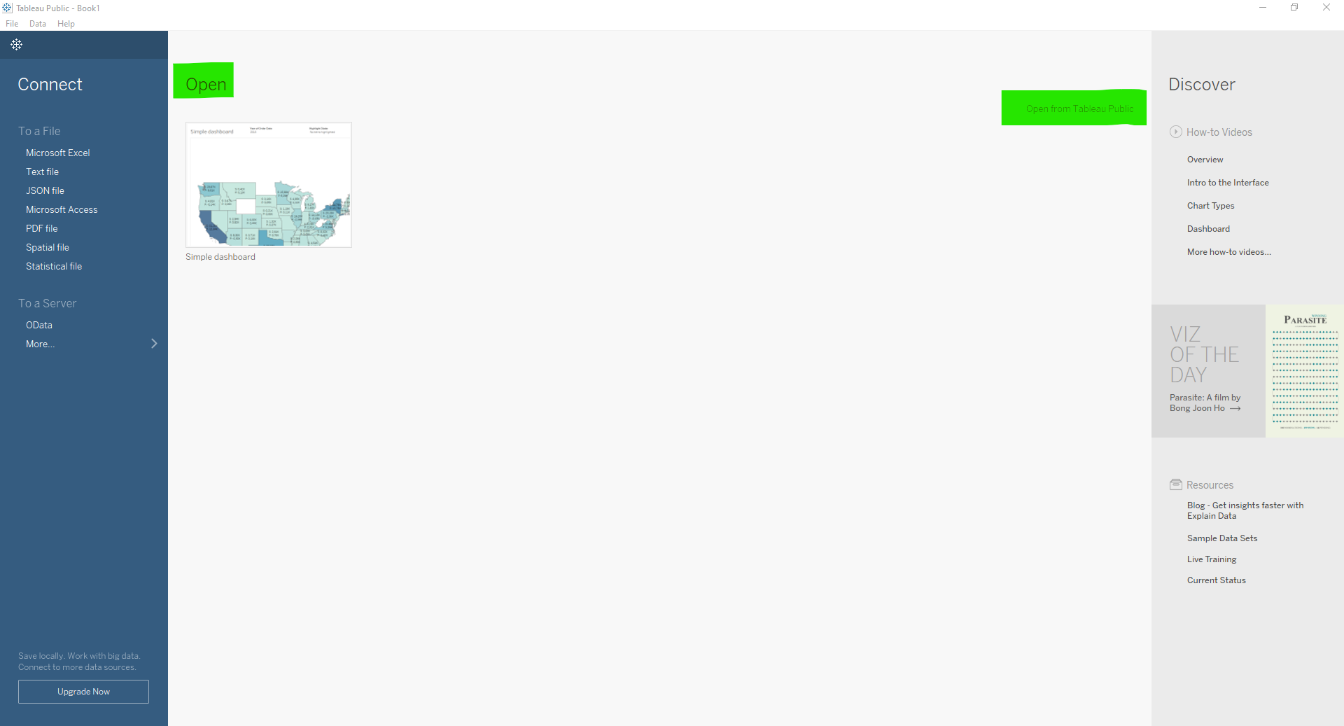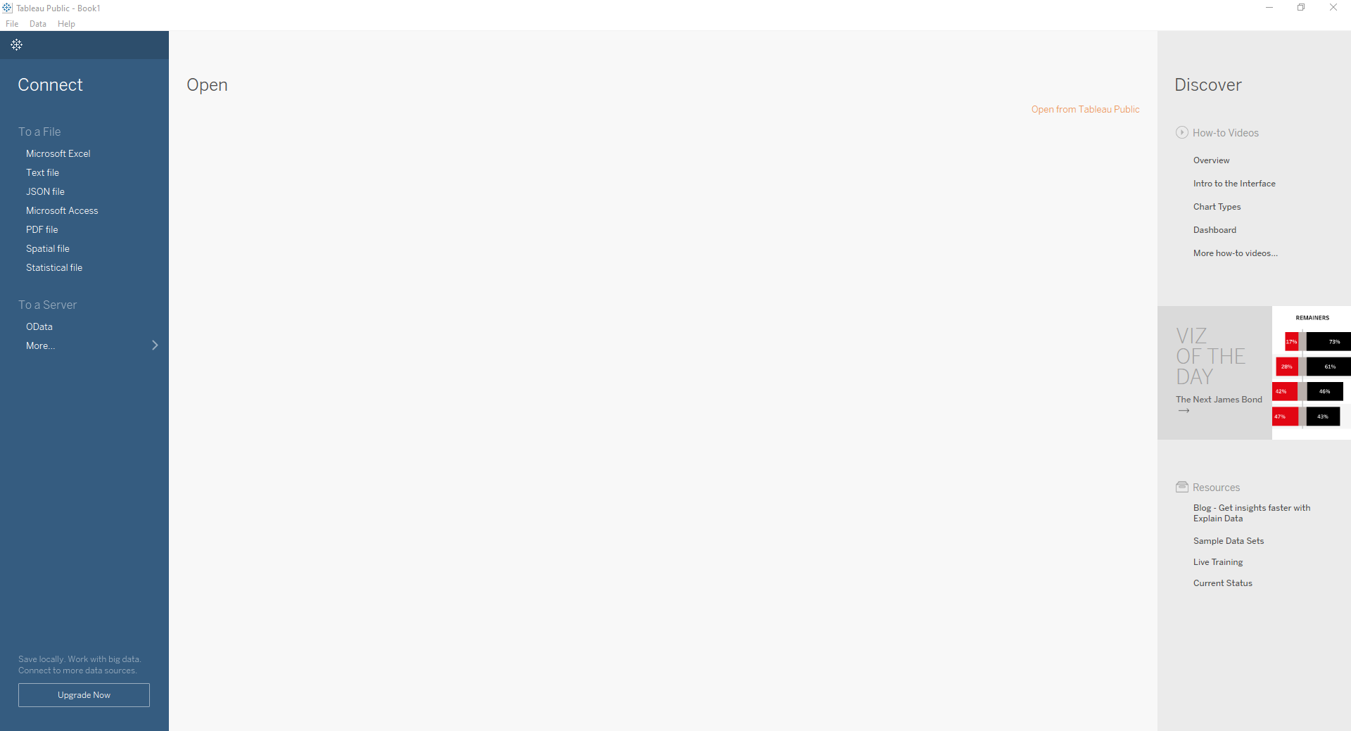 Po uruchomieniu Aplikacji Tableau Public naszym oczom ukaże się nieco okrojony widok w stosunku do tego, co oferuje Tableau Desktop: