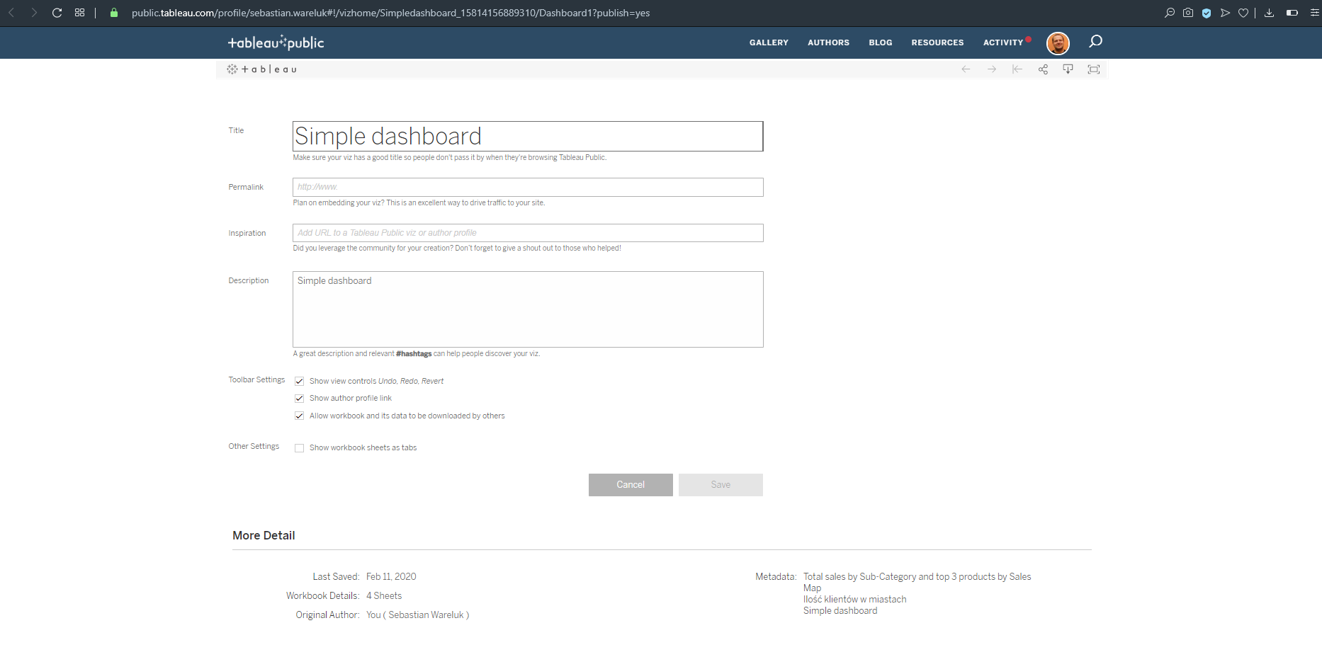 Wybierając opcję ‘Edit Details’ będziesz mógł dostosować szczegółowe ustawienia dotyczące swojej publikacji, m.in. to, czy osoby przeglądające Tableau Public będą mogły pobrać Twój raport w postaci edytowalnego pliku.