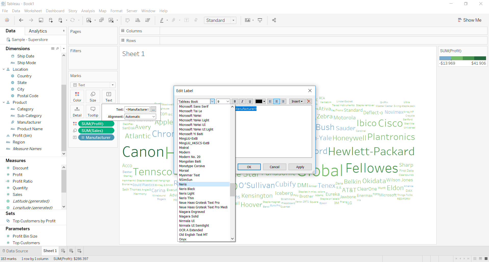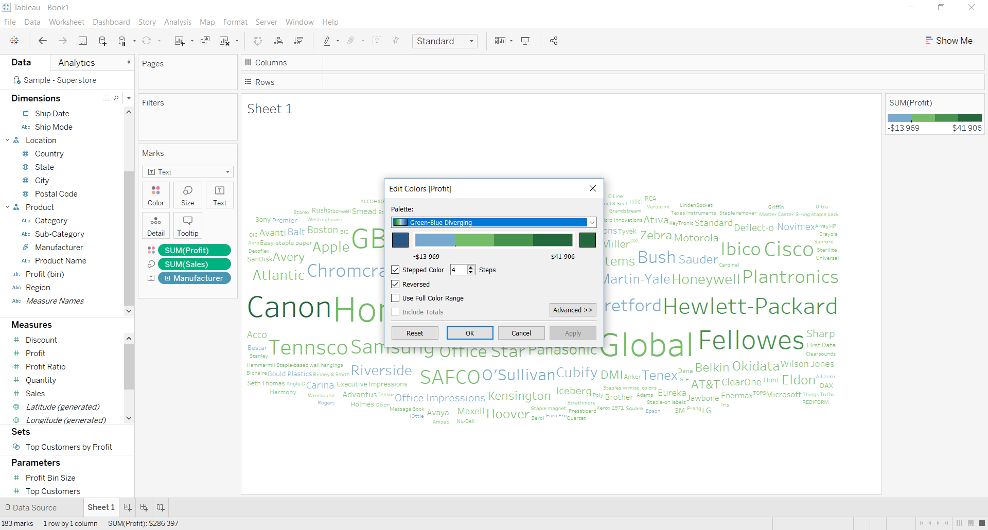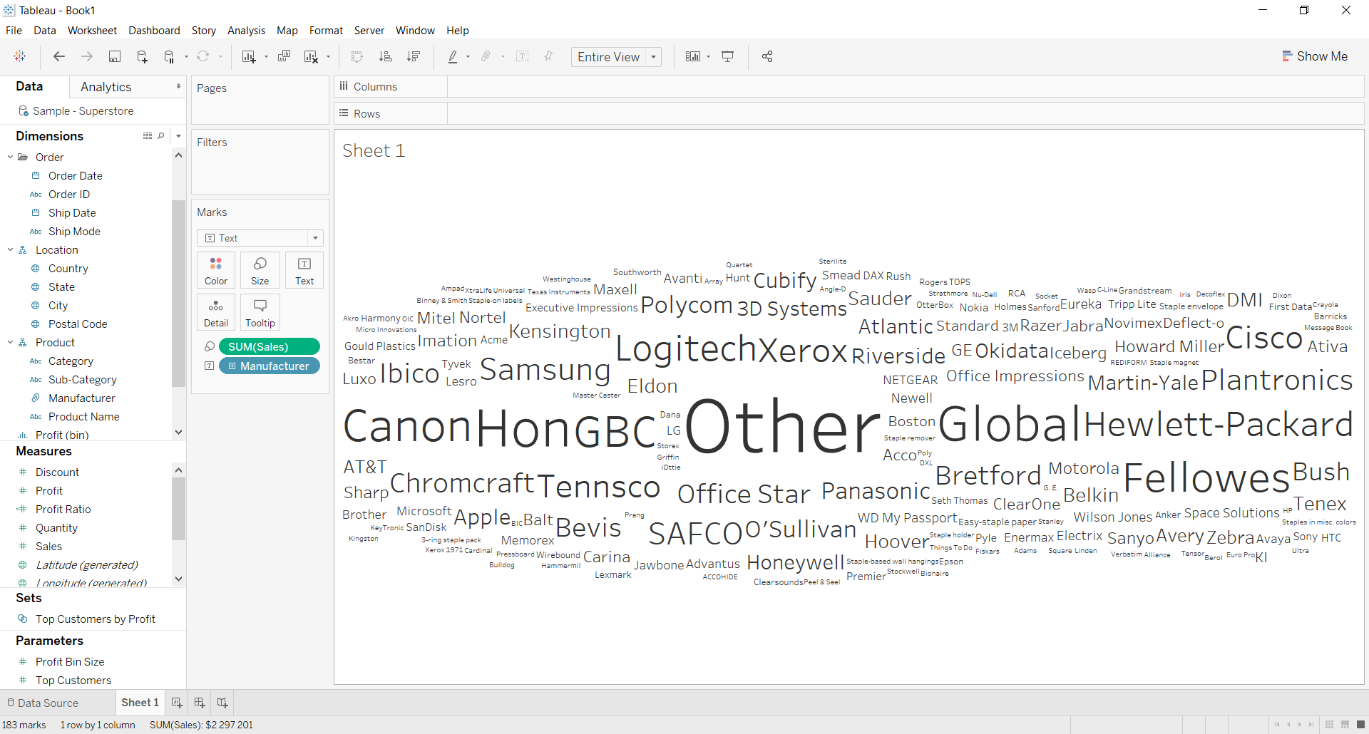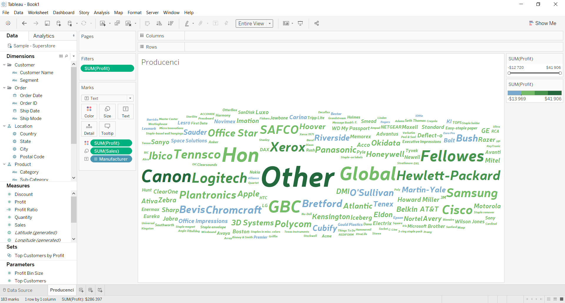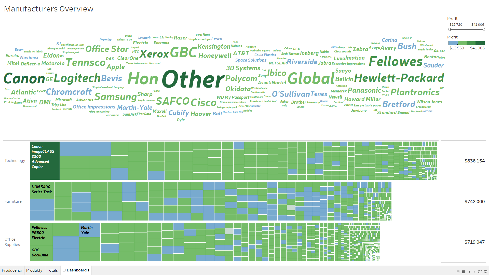 Wróćmy jednak do pracy. Twoja chmura powinna wyglądać podobnie do tej, którą zamieściłem powyżej. Chciałbym jednak, żeby niosła więcej informacji niż tylko to, który producent dostarcza mi produkty, których sprzedaż ma największą wartość. Popracujmy zatem nad walorem estetycznym wizualizacji.