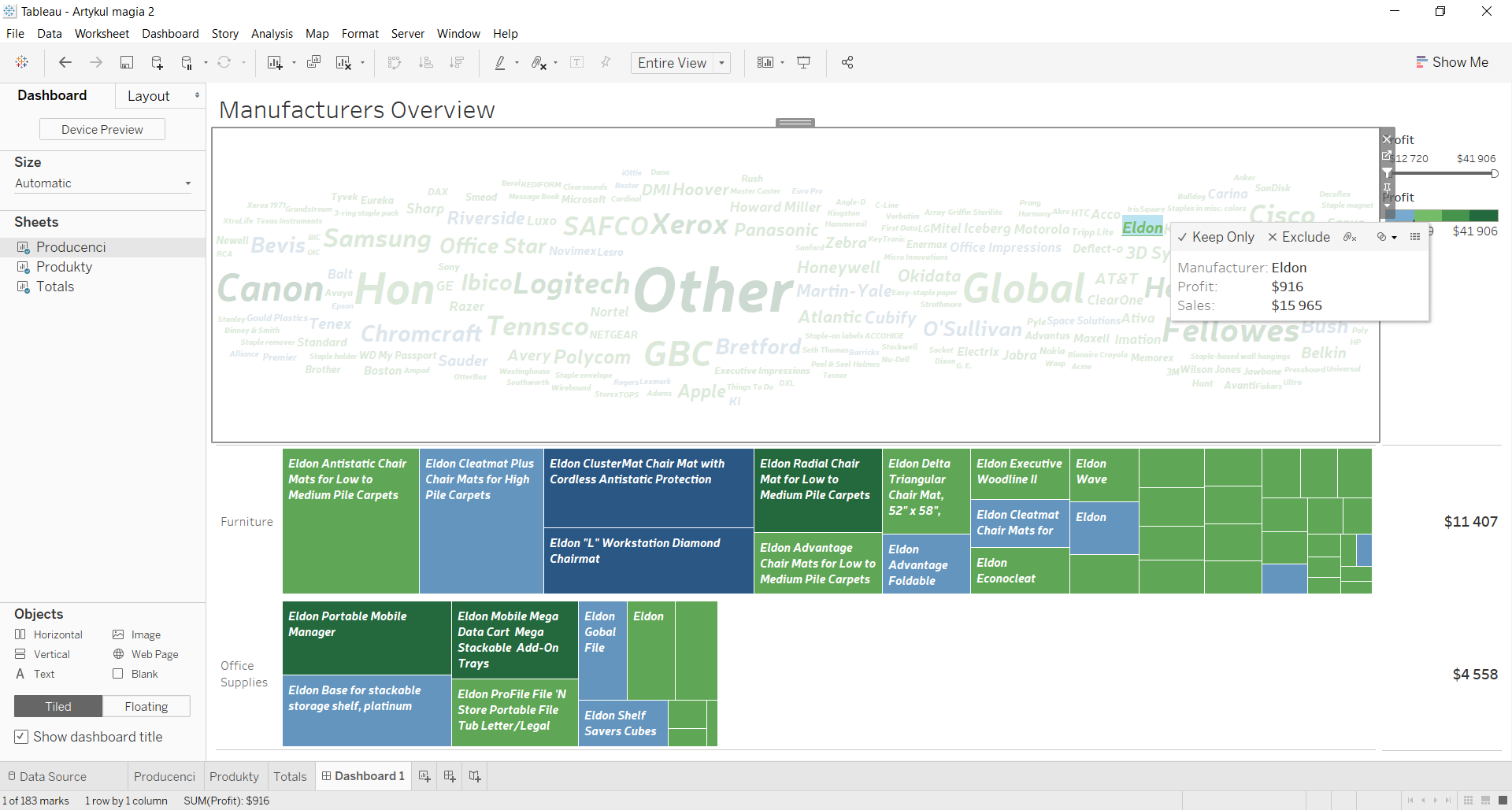 W trzech zakładkach masz przygotowane elementy, które finalnie chcemy połączyć ze sobą na Dashboardzie. Budując Dashboard w menu Size wybierz opcję Automatic, żeby widok zawsze dostosowywał się do wielkości ekranu. Stworzone wcześniej elementy możesz układać na Dashboardzie dowolnie, natomiast koncepcja budowania miar Totals dla treemap w oddzielnym widoku zakłada, że te dwa elementy będą umieszczone obok siebie. Żeby zbudować układ, który widzisz na rysunku poniżej w pierwszej kolejności umieściłem na Dashboardzie chmurę słów, a następnie pod nią element Horizontal Containter. Pozawala on na układanie kolejnych elementów obok siebie, nie wywierając wpływu na inne elementy dashboardu, które znajdują się poza nim. Na koniec formatuję tytuły oraz zaznaczam opcję „Use as Filter” przy chmurze słów. Pozwoli mi to na filtrowanie treemap do poziomu pojedynczego producenta z podziałem na kategorie produktów.