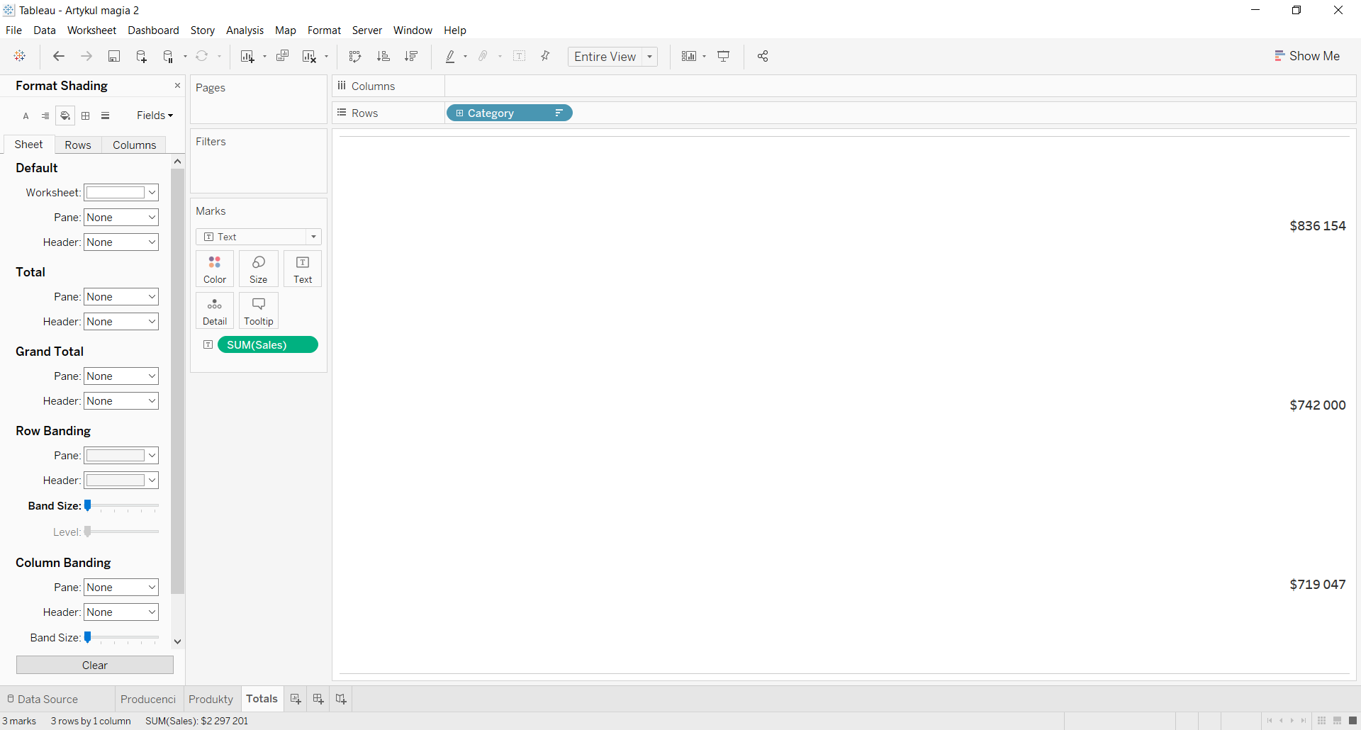 Istotną informacją dla raportu będzie wyświetlenie informacji o sumach wartości Sales dla każdej kategorii. Możesz to zrobić przygotowując dodatkowy element, który pokaże wartości Totals dla każdej kategorii.