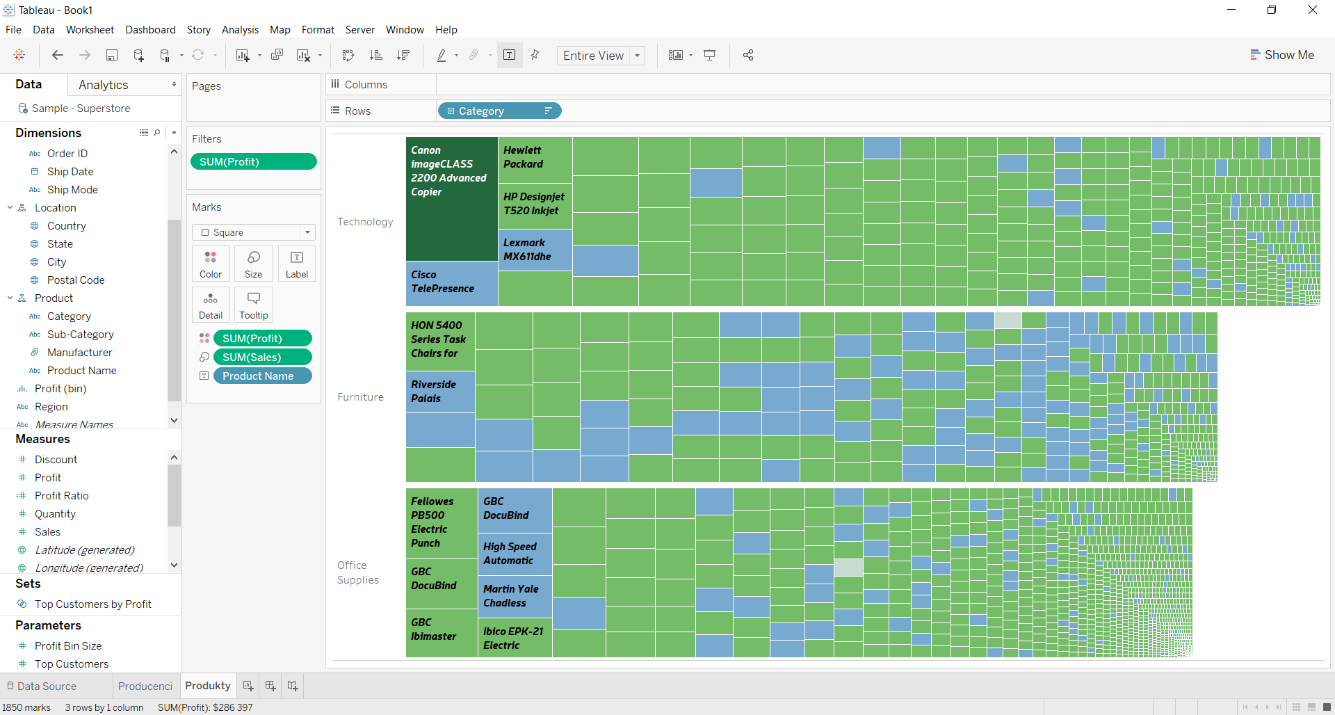 • W rozwijanej liście w obszarze Marks zmień opcję Text na Square (brawo! Mamy treemapę! Ale to nie koniec :-)).