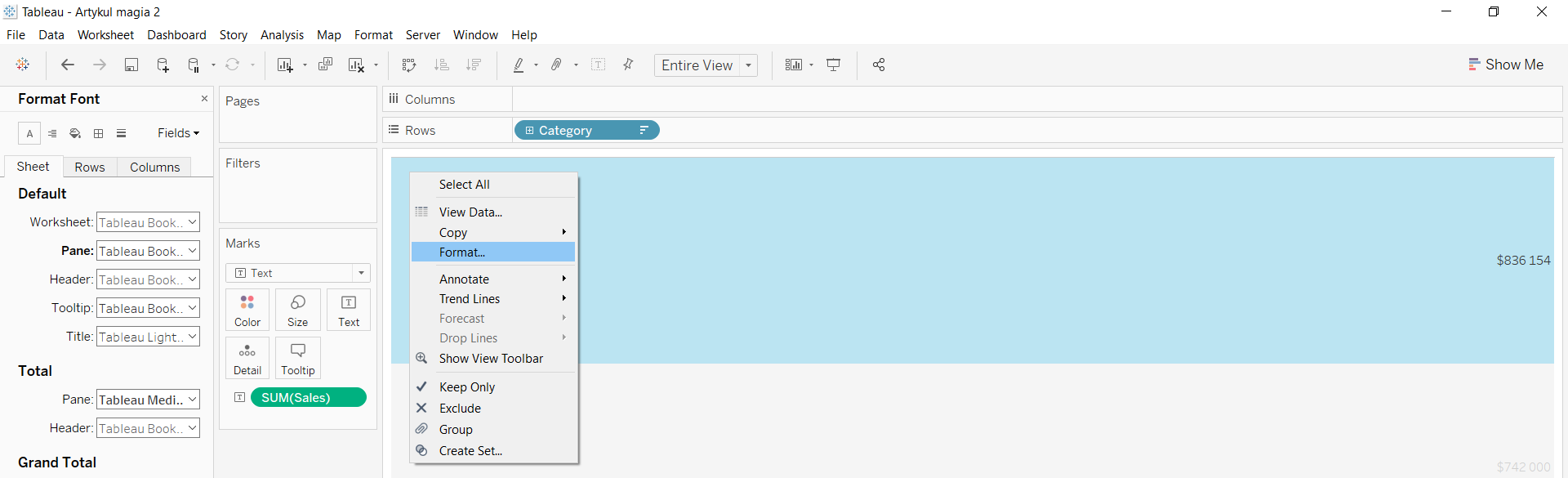 • Kliknij na obszar Text. W nowym okienku wybierz ikonę […]. Kolejne okno pozwoli Ci na zmianę rodzaju czcionki, którą Tableau wykorzystuje w Twoim widoku.