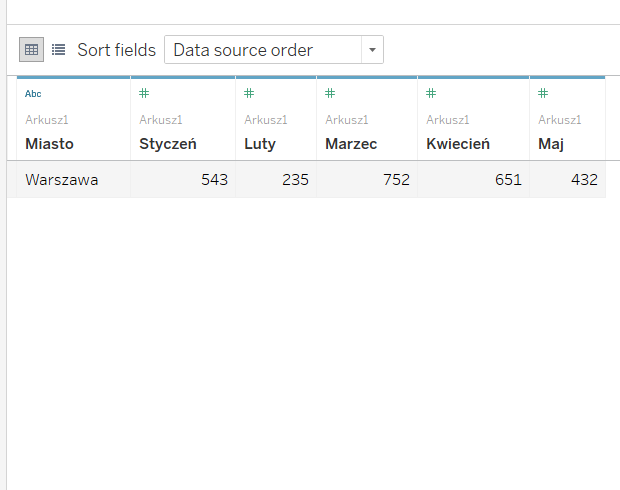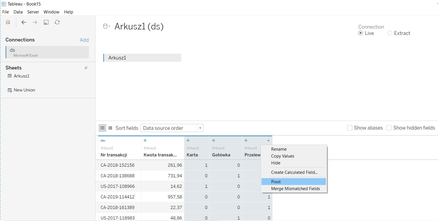 Tutaj z pomocą przychodzi tytułowy Pivot, lub – jak kto woli – transpozycja danych w Tableau. Ta funkcja jest dostępna na etapie podłączania danych do naszej dzielnej aplikacji, a więc zatrzymamy się na chwilę właśnie na tym etapie. Tym, co będziemy chcieli osiągnąć będzie zamiana naszych kolumn z metodami płatności w pojedynczą kolumnę, która zgromadzi te informacje. Drugą kolumną, która jest efektem przekształcenia, będzie informacja z naszymi flagami. Na tym etapie warto również wspomnieć, że niezależnie od tego czy w źródle danych pojawi się z czasem sytuacja, o której wspominałem wyżej, czyli rozszerzenie zakresu flag w kategoriach, pivotowane dane będą te zmiany dynamicznie obsługiwać.