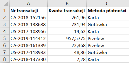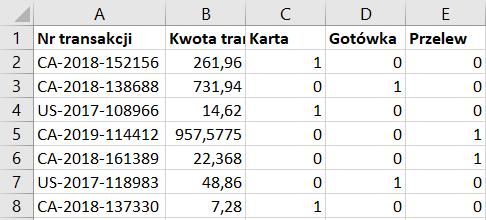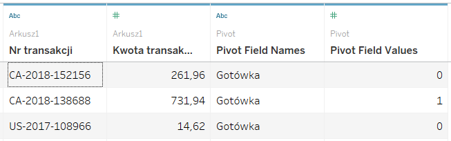 W kolejnym przykładzie pokażę Ci, dlaczego warto pivotować dane i kiedy warto to robić. Na potrzebę tego przykładu posłużę się uproszczonymi danymi, zawierającymi informację o numerze transakcji, kwocie oraz o tym, czy płatność za to zamówienie została zrealizowana przy pomocy karty płatniczej, przelewem czy też nabywca opłacił swoją fakturę gotówką.
