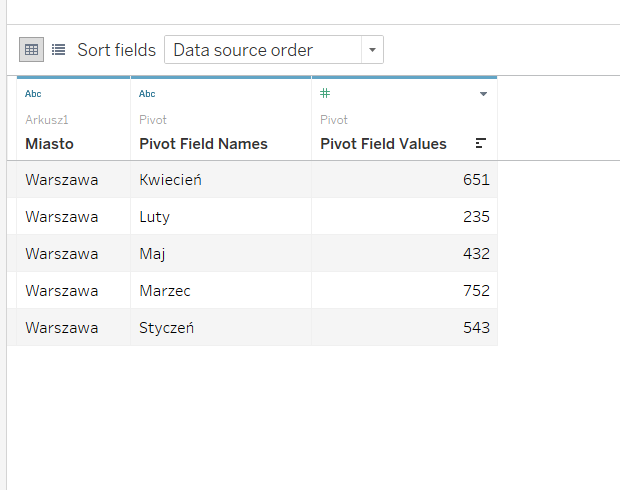 Nic prostszego – w podłączonej do Tableau tabeli, zaznaczamy kolumny, które chcemy objąć przekształceniem. Następnie klikamy prawym przyciskiem myszy na którymś z zaznaczonych nagłówków i z menu wybieramy pozycję Pivot (funkcja ta dostępna jest również w widoku metadanych).