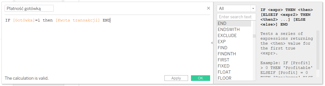 Po podłączeniu danych do Tableau, dla każdej formy płatności, tworzymy nowe pole kalkulowane, wg poniższego wzoru: