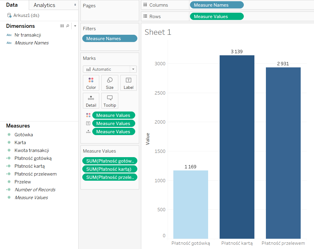 Następnie posługując się elementami, które Tableau generuje przy każdych podłączanych do aplikacji danych, czyli Measure Names i Measure Values, budujemy wizualizację tak, jak pokazuje poniższy rysunek: