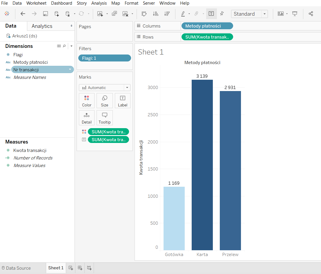 I tutaj, będzie bajecznie prosto – żeby stworzyć prosty wykres słupkowy podobny do tego z poprzedniego przykładu mogę wykorzystać pewną własność Tableau, która pozwala na szybkie, automatyczne budowanie wykresów. Klikam dwukrotnie na pigułkę Kwota transakcji, następnie na metody płatności, a na koniec przenoszę Flagi do pola filtrów, zaznaczając tylko wartość 1. Pozostałe efekty kosmetyczne to oczywiście kwestia gustu lub potrzeb.