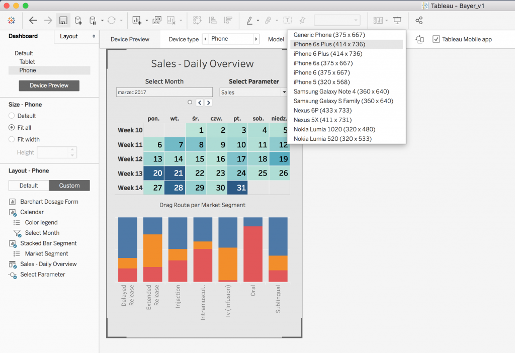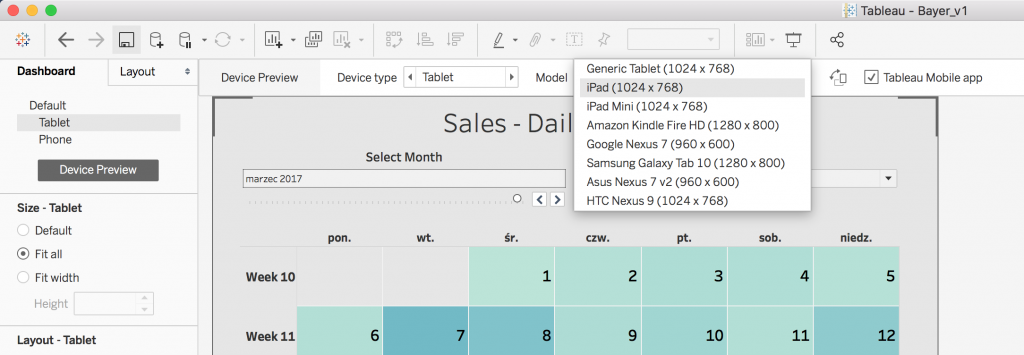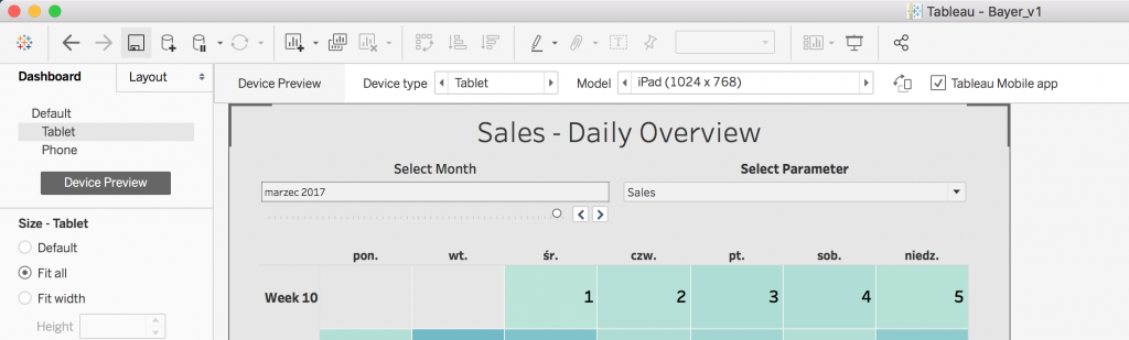 Aplikacja Tableau Desktop pozwala do przygotowanego raportu zdefiniować specyficzne układy czy widoki w zależności od urządzenia, na którym ów raport będzie wyświetlany. Przyspiesza to zdecydowanie proces tworzenia rozwiązań raportowych gdyż eliminuje konieczność projektowania osobnych raportów na każde urządzenie oraz rozwiązuje problem z aktualizacją wszystkich wersji raportów.