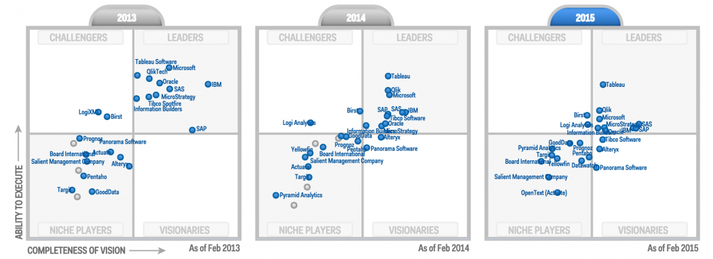 rys. 1 – zmiany w trendach na rynku systemów BI, źródło: https://clinthuijbers.files.wordpress.com/2015/02/magic-quadrant-for-business-intelligence-and-analytics-platforms-2015-comparison.png