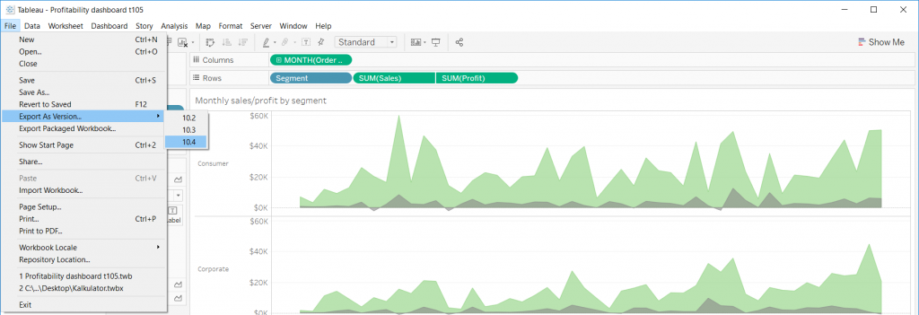 Dodatkowo z poziomu Tableau Desktop będziemy mogli zapisać nasze prace w poprzednich wersjach Tableau do wersji 10.2 włącznie. To dość istotna kwestia w kontekście płynności współpracy w organizacjach w których nie wszyscy użytkownicy jednocześnie aktualizują swoje oprogramowanie lub tam, gdzie publikujemy na serwerze który działa w którejś z poprzednich wersji.