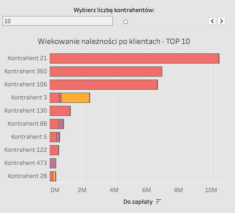 Element #3 (rys 5 i 6) raportu oferuje nam szybki przegląd klientów o największej sumie przeterminowanych należności z podziałem na poszczególne dokumenty oraz informację o długości przeterminowania. Użytkownik raportu ma możliwość, w dowolnej chwili, zwiększenia lub zmniejszenia suwakiem ilości wyświetlanych kontrahentów.
