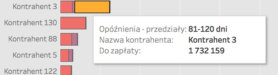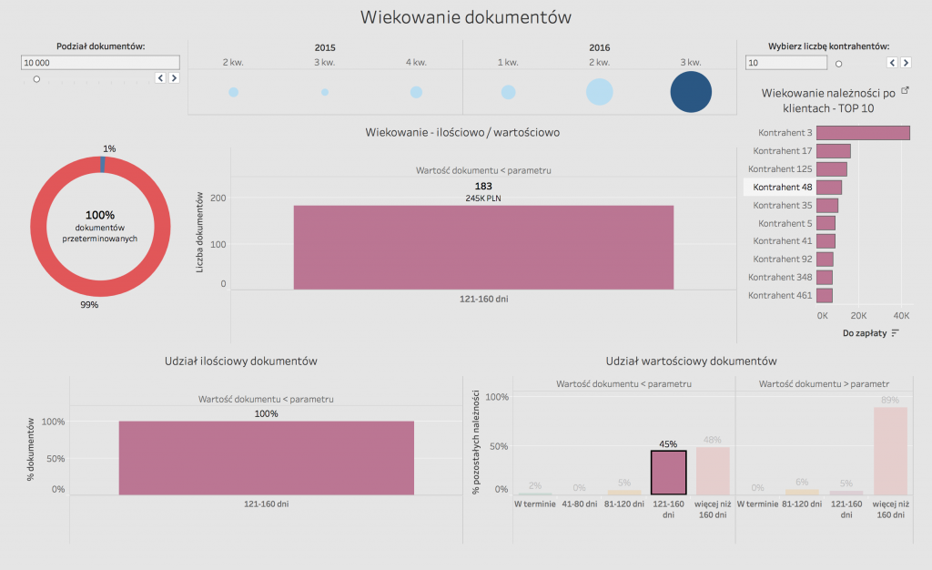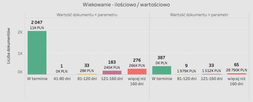Podstawowe okno (rys 7) prezentuje ilość dokumentów oraz ich sumaryczną wartość w każdej z grup w podziale na przedziały wiekowania. Przedziały zostały skonfigurowane w narzędziu Tableau i mogą być dowolnie modyfikowane przez analityka lub po modyfikacji przez odbiorcę raportu.