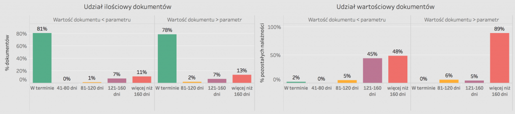 Porównując udziały ilościowe oraz wartościowe możemy zauważyć, że w grupie dokumentów o wartości >10000 pln jedynie 13% dokumentów generuje nam aż 89% procent należności przeterminowanych. Podobną sytuacja dotyczy grupy dokumentów o wartościach mniejszych od 10000 pln. Tutaj łącznie 18% dokumentów odpowiedzialne jest na 93% wartości zadłużenia.