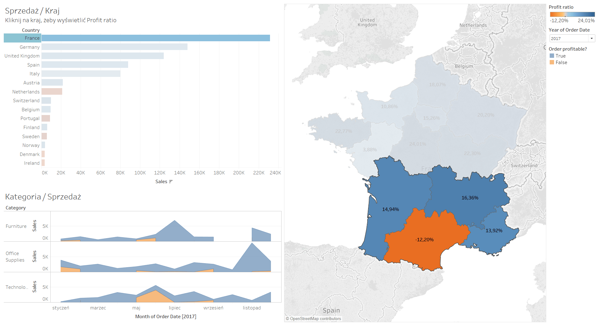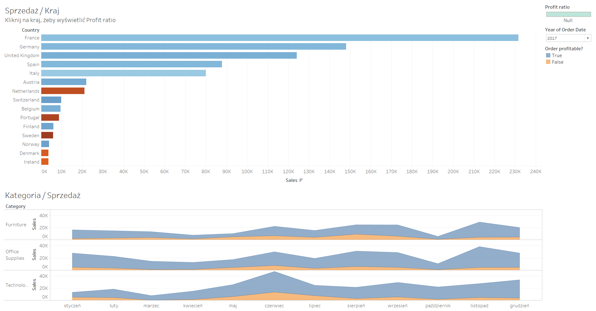 W tym przykładzie pracujemy na bazie Sample – EU Superstore. Na samym wstępie zwróć uwagę na to, jak budowane są kolejne elementy w oparciu o hierarchię danych. Pierwszy z nich, to ogólny Bar Chart, który pokazuje dwie podstawowe informacje, czyli wysokość sprzedaży oraz Profit Ratio. Posłuży on nam również jako główny filtr dla naszych danych.