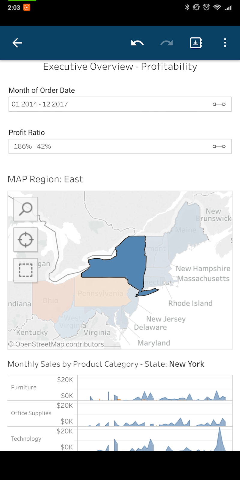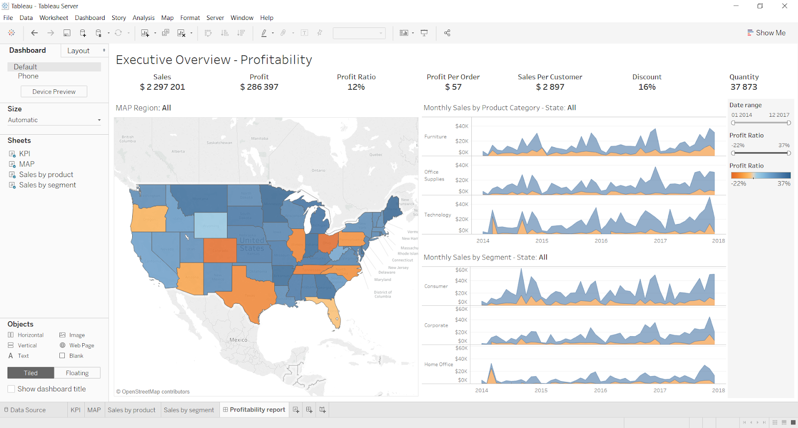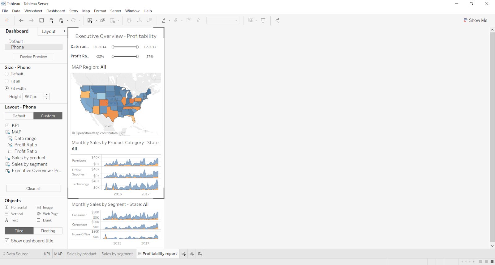 Dashboard ma stworzoną alternatywną wersję dla telefonów komórkowych, a więc kiedy serwer rozpozna, że użytkownik zalogował się przez aplikację mobilną, to udostępni mu widok odpowiedni do rozmiaru jego ekranu. Alternatywne widoki dla smartphone’ów lub tabletów nie są w żaden sposób narzucane czy ograniczane przez Tableau. Mamy pełną dowolność w dostosowywaniu ich do naszych potrzeb.