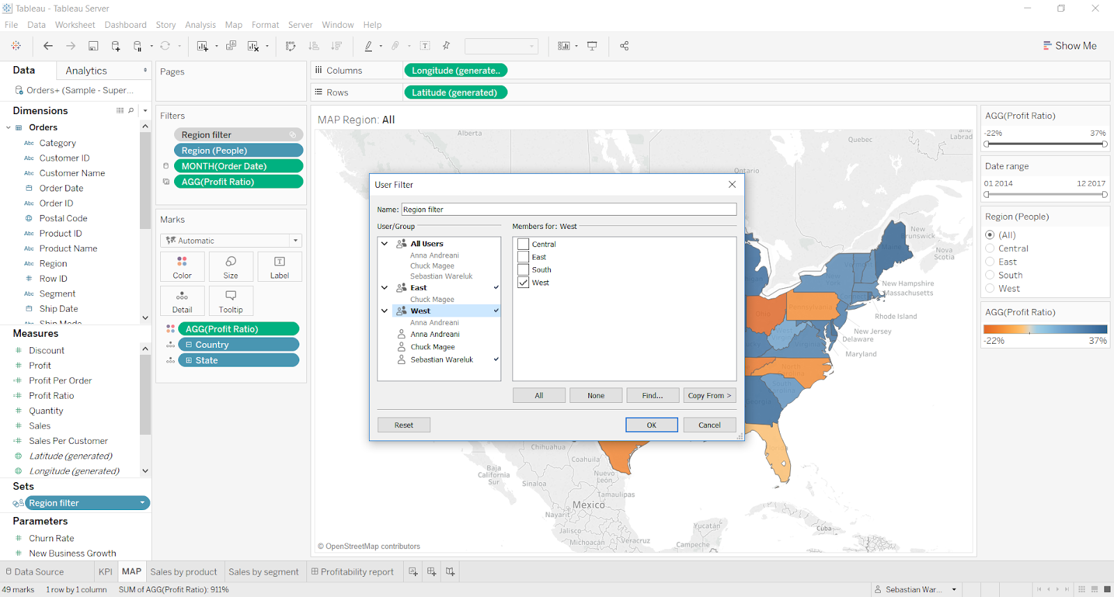W tej chwili raport wygląda identycznie z perspektywy wszystkich użytkowników. Chcąc osiągnąć zamierzony cel, czyli opcję w której każdy użytkownik będzie widział tylko swoje regiony, musimy wrócić do Tableau Desktop i przechodzimy do jednego z widoków. Ponieważ naszym założeniem jest podział na regiony, najprościej będzie zacząć od mapy. Będąc w zakładce z wizualizacją mapy, wybieram menu Server, polecenie ‘Create User Filter’ oraz pole według którego chcemy filtrować dane. W tym przykładzie będzie to ‘Region’.