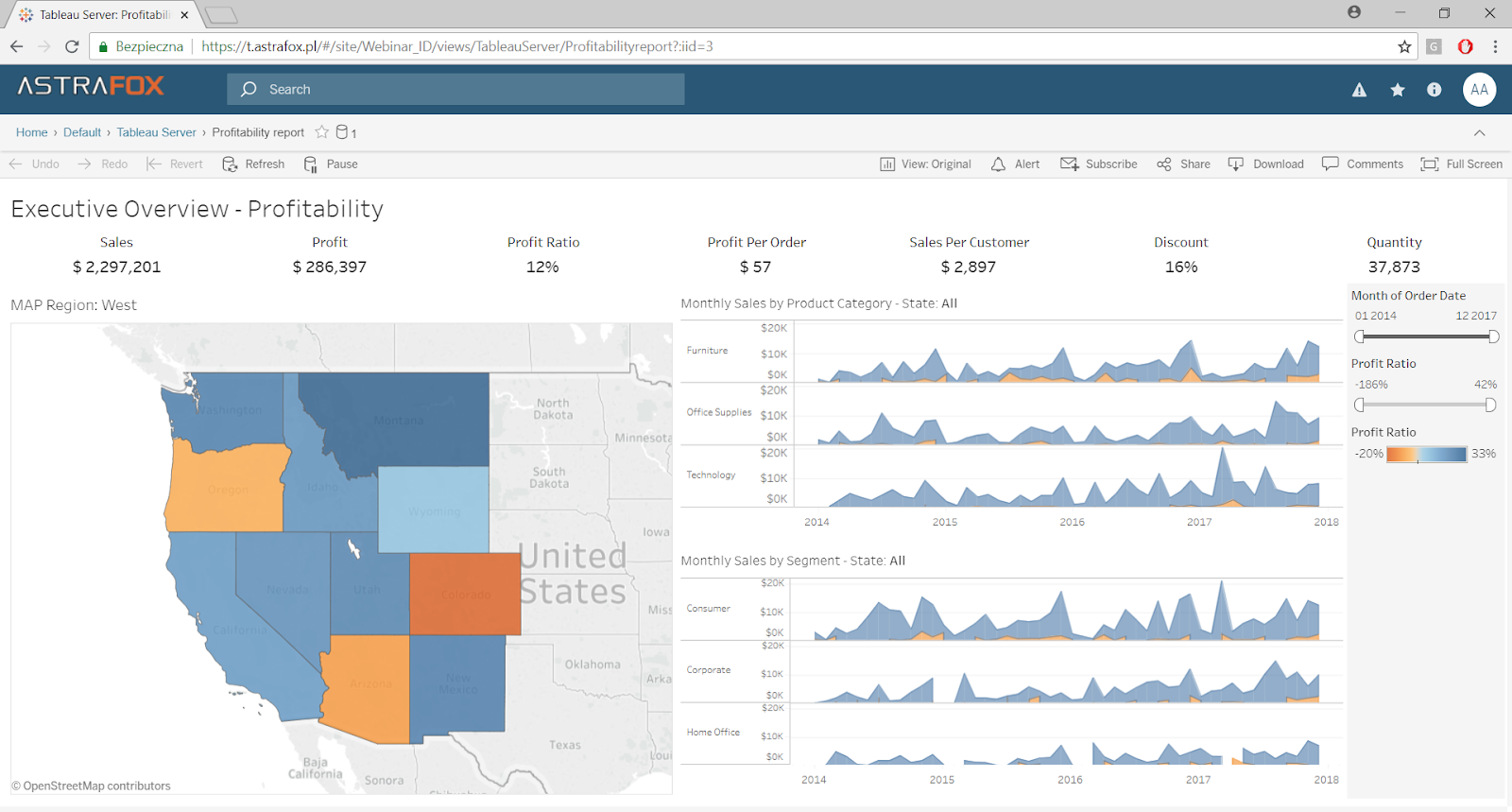 Odbiorcy mogą również dodawać komentarze do raportów, zapisywać je w postaci obrazów i jeśli ich uprawnienia na to pozwalają – edytować je w oknie przeglądarki, mając do dyspozycji narzędzie, które jest podobne pod względem funkcjonalności do Tableau Desktop. Wszystkie funkcje o których mowa (z wyjątkiem edycji) są dostępne również z poziomu aplikacji Tableau Mobile.