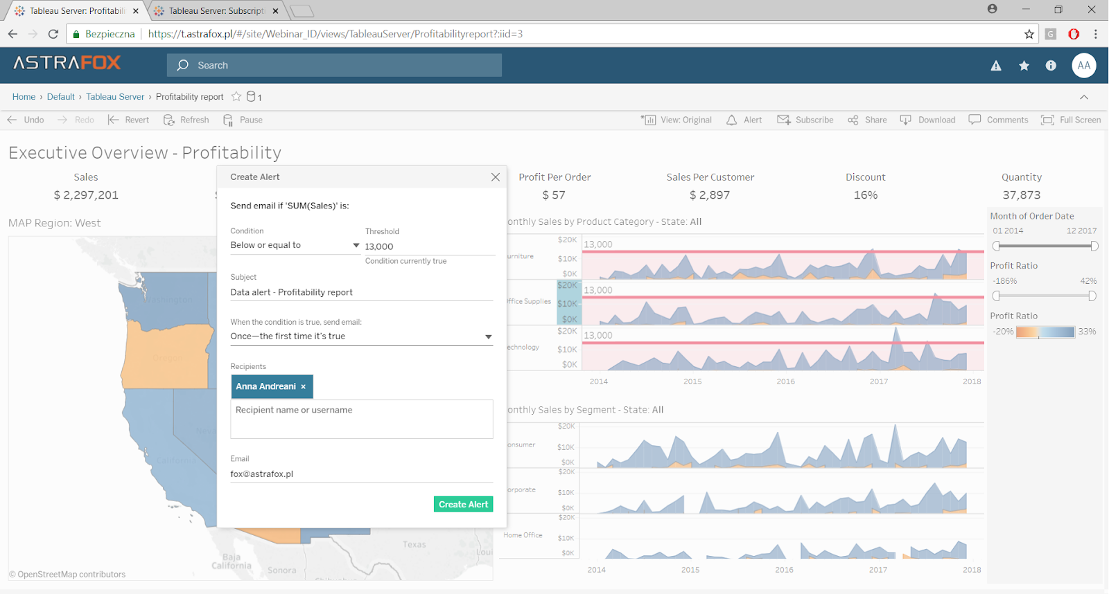 Najważniejszą rzeczą na którą chciałbym zwrócić Twoją uwagę jest to, że zamiast tworzyć kilka kolejnych raportów dla kolejnych osób i regionów możemy stworzyć tylko jeden, a następnie odpowiednio zarządzić uprawnieniami, aby każdy odbiorca widział tylko swój element całości. Jeśli chcemy udostępnić raport na urządzenia mobilne, to bez problemu go do tego dostosujemy, a Tableau uchroni nas od schematycznej pracy i powielania szablonowych raportów. Serwer zadba również o odświeżanie danych w dowolnym interwale czasowym.